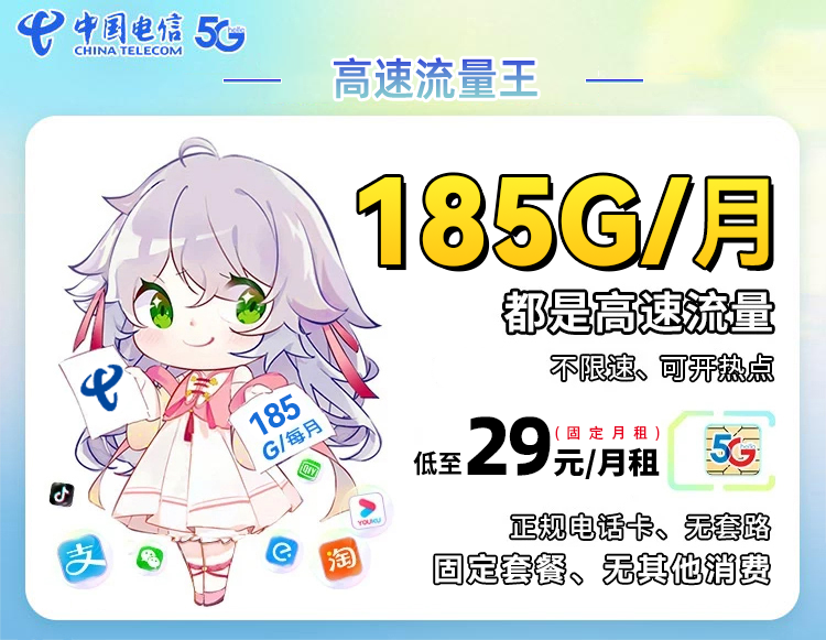 长时间卡:优惠期长达20年或“自动续约”,资费安稳,合适学生、家庭长时间用(比方电信29元185G长时间套餐)。